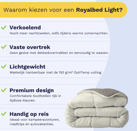 Droom weg onder onze Zelesta Royalbed Light. Dit dekbed is geschikt voor de wasmachine & droger en heeft bovendien geen overtrek nodig. Dit bespaart tijd en energie, plus je hoeft nooit meer de strijd aan te gaan met een eigenwijs dekbedovertrek.