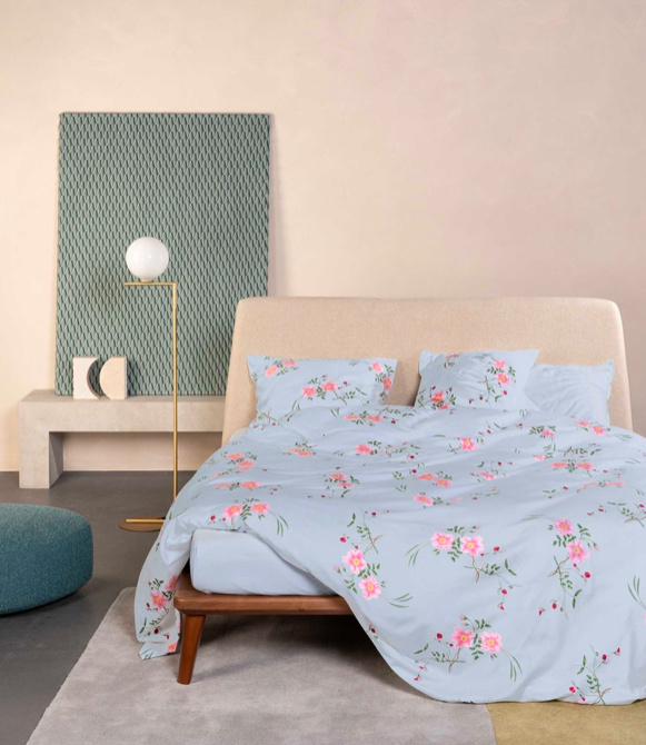 De losse takjes en kleine bloemetjes vormen een speelse print die licht en natuurlijk aanvoelt. Hierdoor ontstaat een ontspannen sfeer die perfect past in een rustige slaapkamer.