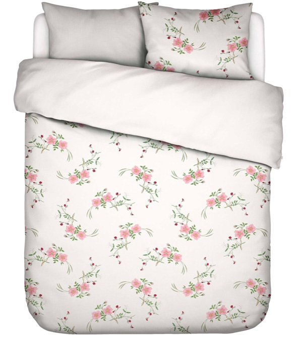 Het Essenza witte dekbedovertrek Maren heeft een vriendelijk en luchtig bloemendessin met handgetekende bloemtakjes in zachte roze en groentinten. Door de witte of ijsblauwen ondergrond geeft het geheel een frisse en rustige uitstraling.