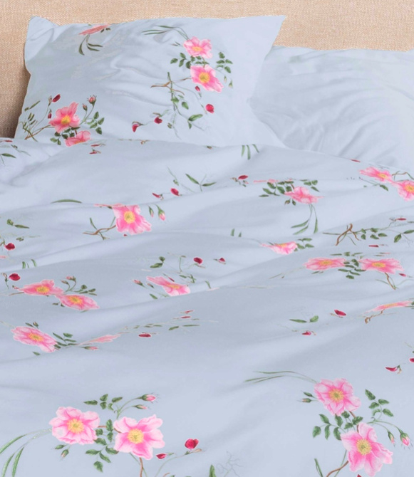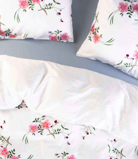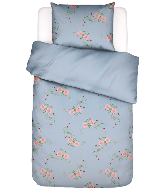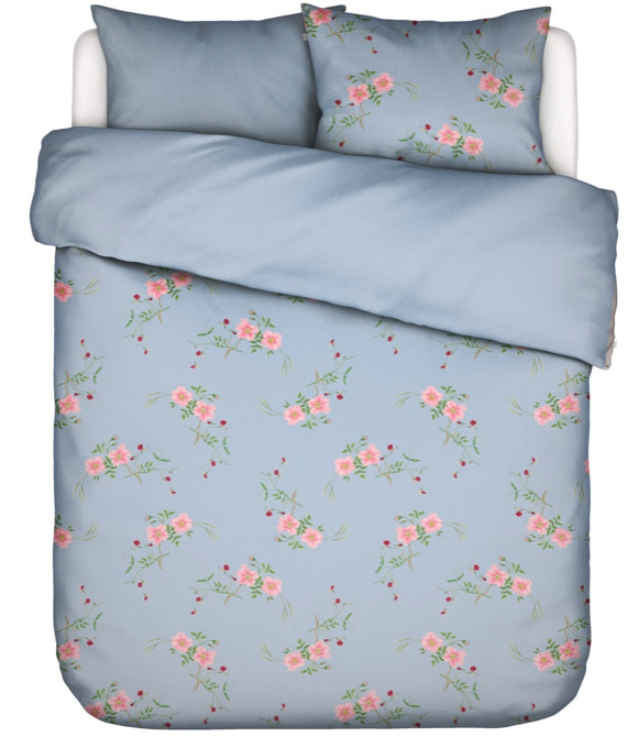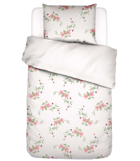 Het Essenza witte dekbedovertrek Maren heeft een vriendelijk en luchtig bloemendessin met handgetekende bloemtakjes in zachte roze en groentinten. Door de witte of ijsblauwen ondergrond geeft het geheel een frisse en rustige uitstraling.